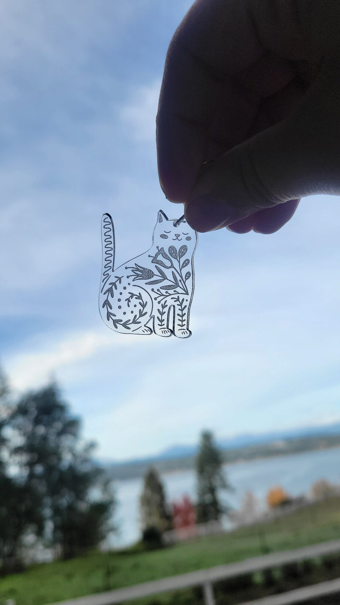 Adorable cat-shaped earrings with a folk art floral design. Cut and engraved on 1/8" clear acrylic. Cat measures approximately 1.5" tall. Ear hooks are stainless steel.